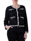 A classic Chanel-style jacket featuring a button-front closure, offering timeless elegance and sophistication.