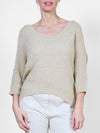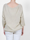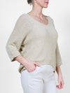 This pull-on sweater in shimmering Gold Lurex features a loose knit texture and elegant 3/4 length sleeves. Light and breathable with a subtle glittery finish, it’s perfect for layering or wearing on its own for a touch of sparkle and effortless style.