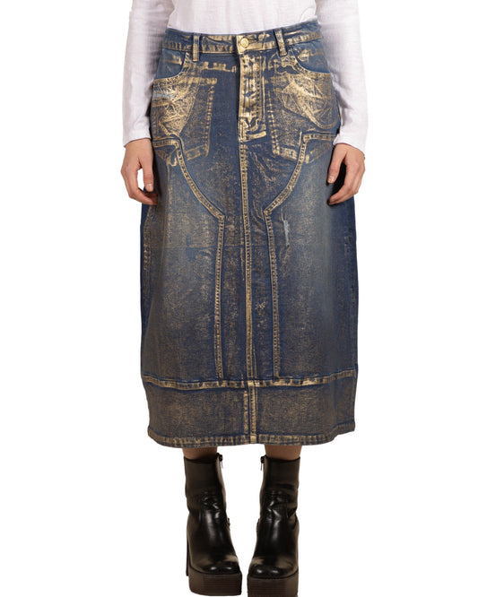 Gold Silverfoil Front Multi Seam 5 Pkt Distressed Trim Denim Skirt