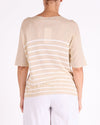 This V-neck T-shirt features a multi-stripe lurex finish accented with a triple feather motif for a subtle touch of shine and texture. Designed with a lightweight feel and an easy, flattering fit, it transitions effortlessly from casual daytime looks to elevated evening styling. Ideal paired with denim, tailored pants, or layered under a jacket.