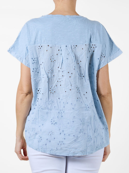 Airy blue T-Shirt with Floral Embroidered Pocket and Eyelet Back Panel