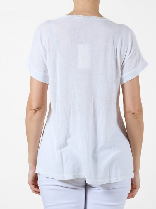 White T-Shirt with Floral Embroidered Pocket and Eyelet Back Panel