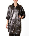 This versatile black shirt features a foil front with a pleated lamé back for an eye-catching contrast. Button front and roll-up sleeves add functionality, making it perfect for day-to-night transitions.