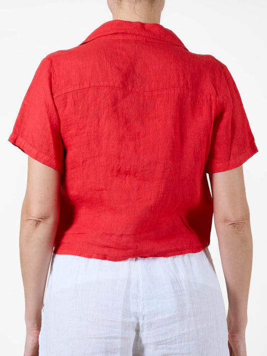 Red Short Sleeve Button-Up Blouse