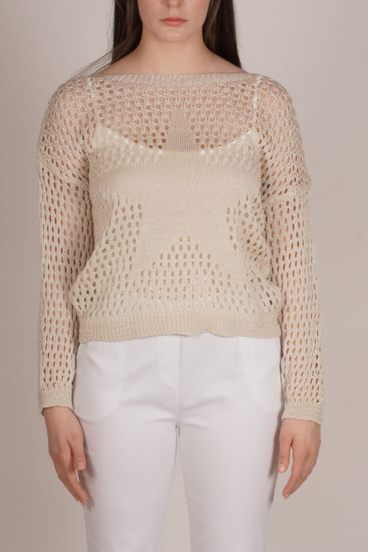 Beige Drop Shoulder Combo Knit Shimmer Top