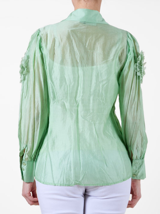 Green Button-Up Blouse with Fabric Flower Detailing