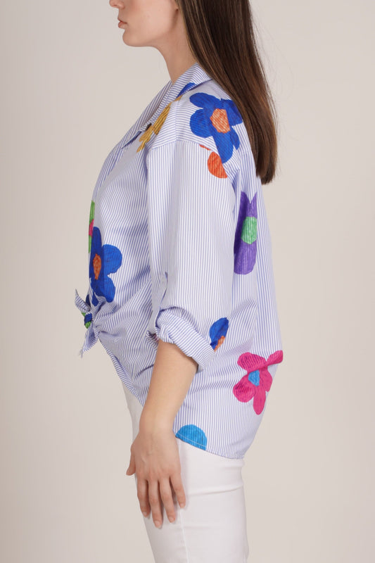 Ocean Blue Long Sleeve Button-Up Top with Daisy Print