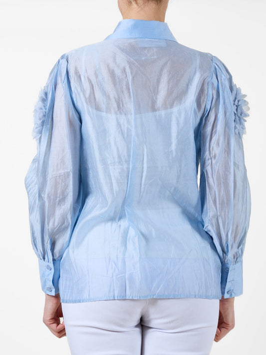 Sky Blue Button-Up Blouse with Fabric Flower Detailing