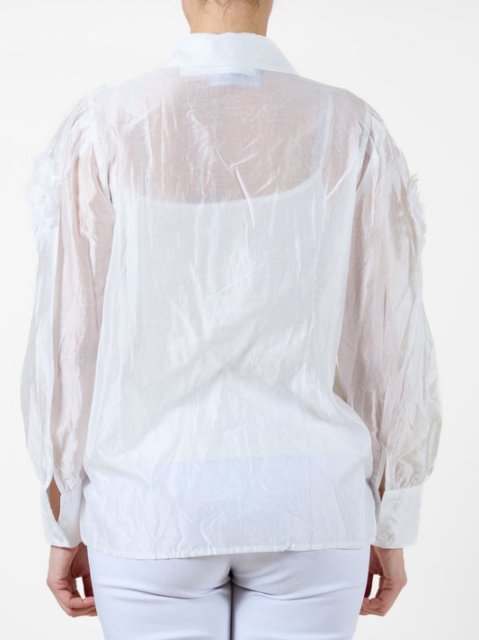 White Button-Up Blouse with Fabric Flower Detailing