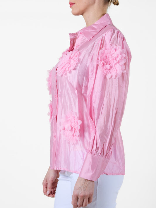 Rose Button-Up Blouse with Fabric Flower Detailing