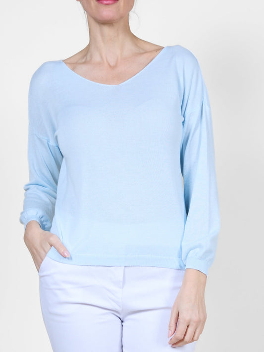 T-shirt bleu clair avec poche brodée de fleurs et empiècement à œillets au dos
