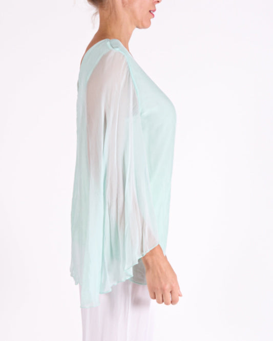 Seafoam Boat Neck Novelty Open Sleeve Front Blouse