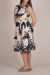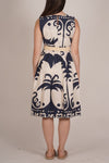 Fluide et audacieuse, cette robe sans manches d'un bleu nuit profond arbore un imprimé tropical et un col montant flatteur pour une allure à la fois élégante et décontractée. Une ceinture beige souligne la taille et met en valeur la silhouette, ce qui en fait le choix idéal pour les escapades estivales, les réunions entre amis ou les vacances.