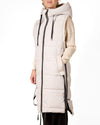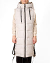 Ce gilet couleur neige est doté d'une fermeture éclair sur le devant ornée de rubans et de deux poches pratiques. La capuche apporte une touche de chaleur et de style supplémentaires.