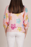 Apportez une touche de couleur à votre tenue avec ce pull à col rond et imprimé marguerites multicolores couleur œillet. Le fond rose œillet doux contraste joliment avec les grandes marguerites multicolores orange, roses, turquoise et bleues. Ce haut à manches courtes est idéal pour celles qui souhaitent insuffler une allure à la fois ludique et chic à leur garde-robe, que ce soit pour un brunch décontracté ou une journée ensoleillée.