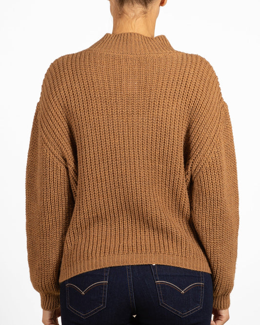 Pull à col montant couleur cognac avec détail doré sur le devant et coupe carrée