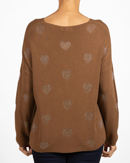 Pull cognac à col en V et épaules tombantes, entièrement en lurex avec des cœurs.