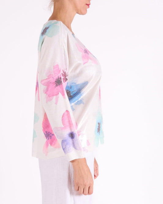 Peach V Neck Drop Shoulder Foil Floral Print Studed Pullover