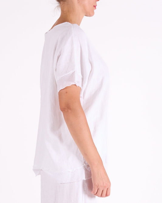 White Scoop Neck Raw Edge Hem Trim Top