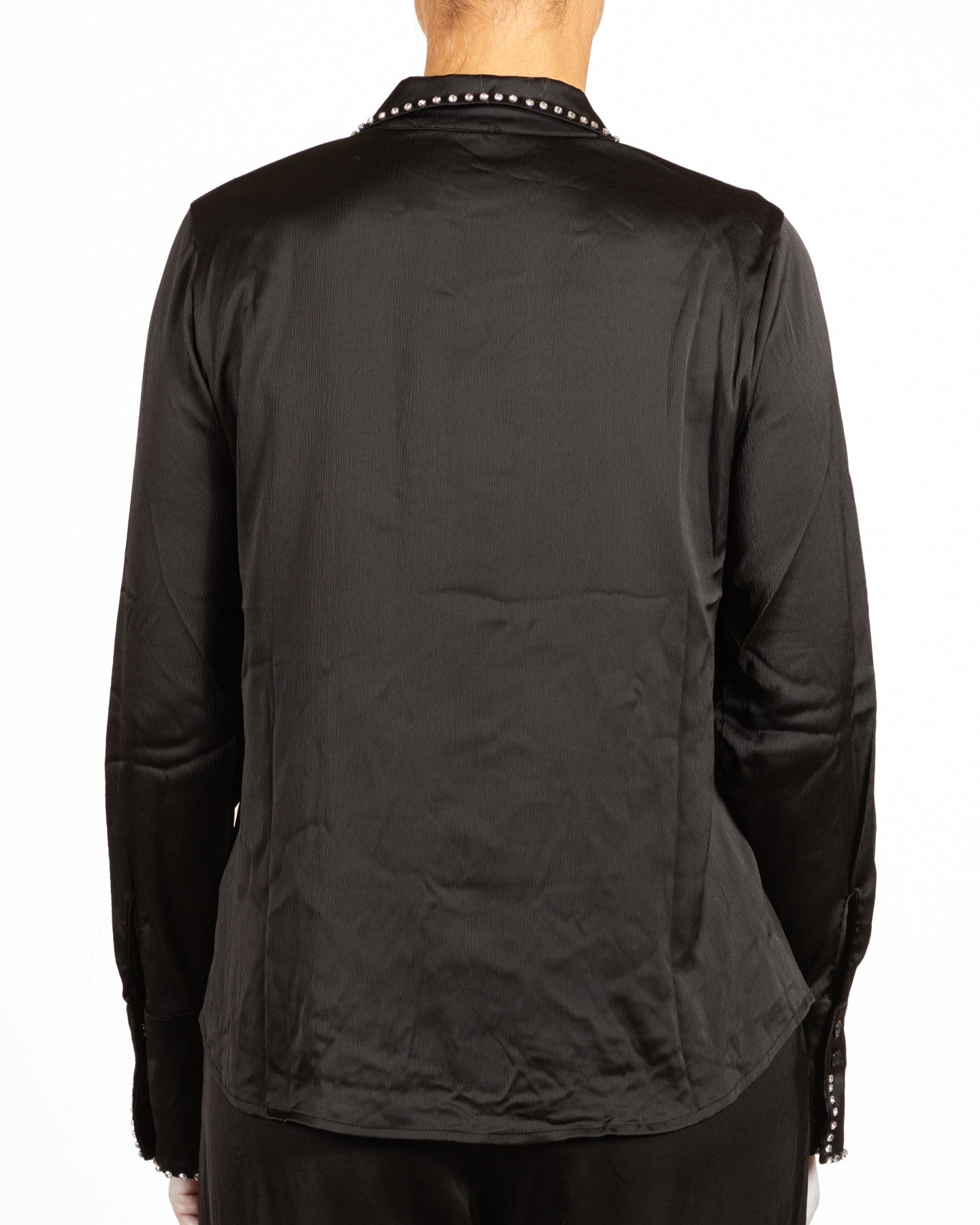 Chemisier noir à boutons sur le devant, col orné de strass et manches détaillées.