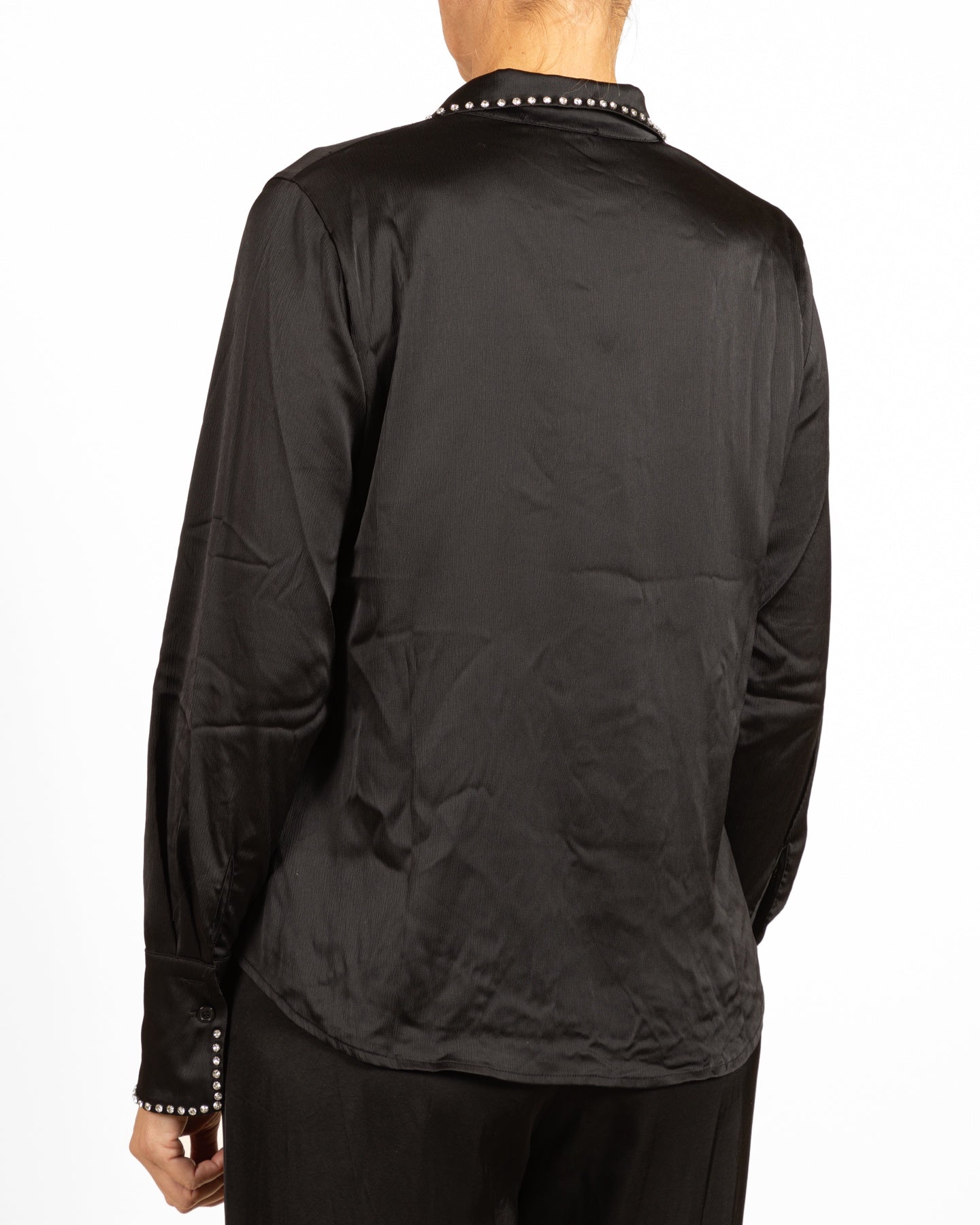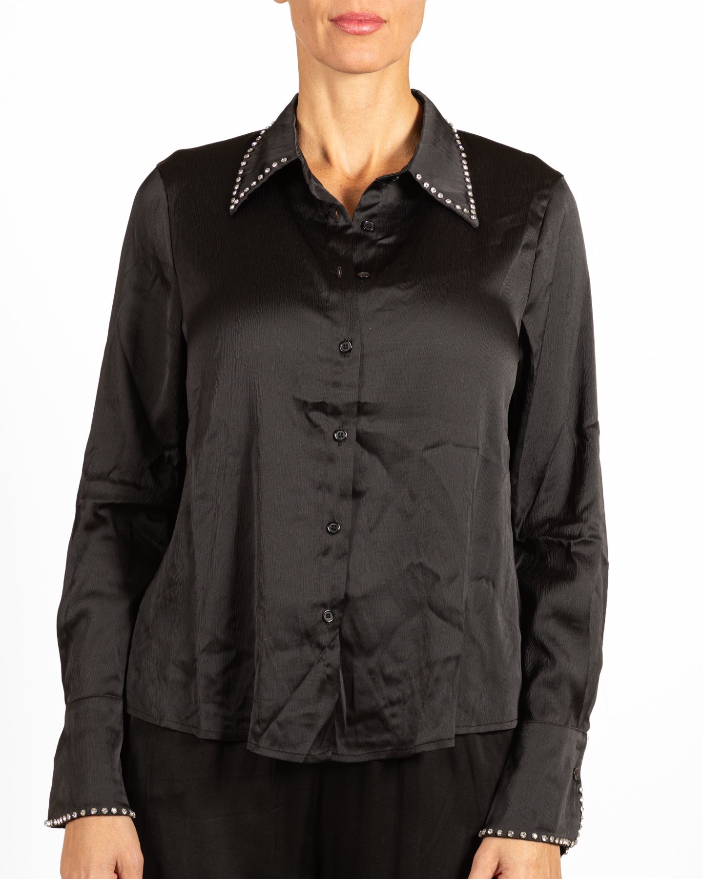 Rehaussez votre garde-robe d'une touche d'élégance avec ce chemisier noir boutonné, orné de strass au col et aux manches. Son design épuré offre un parfait équilibre entre sophistication et éclat discret.