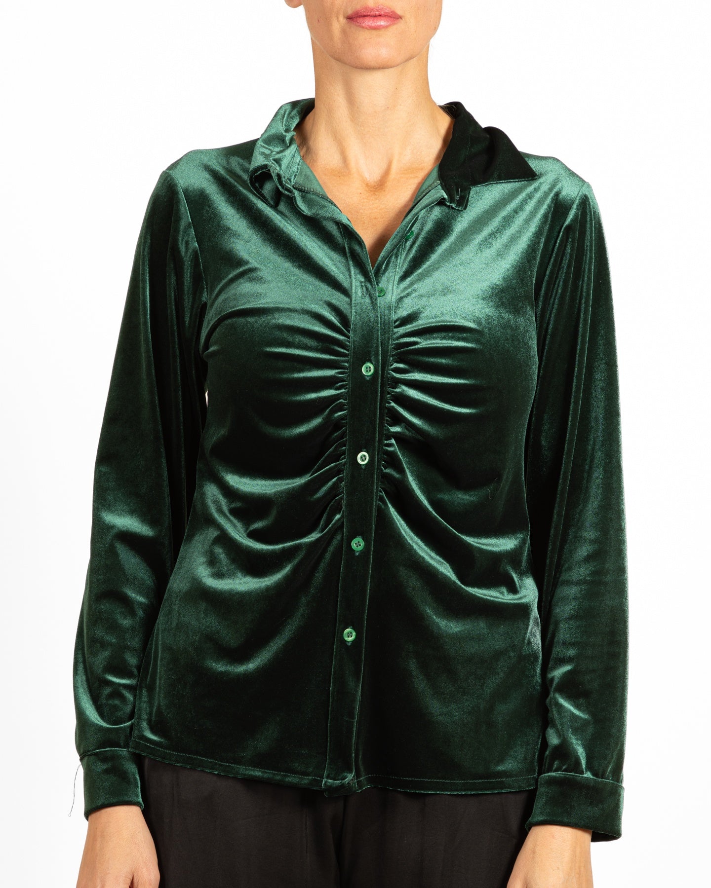 Chemisier en velours vert émeraude à boutons et fronces sur le devant, orné de plis sur le devant.