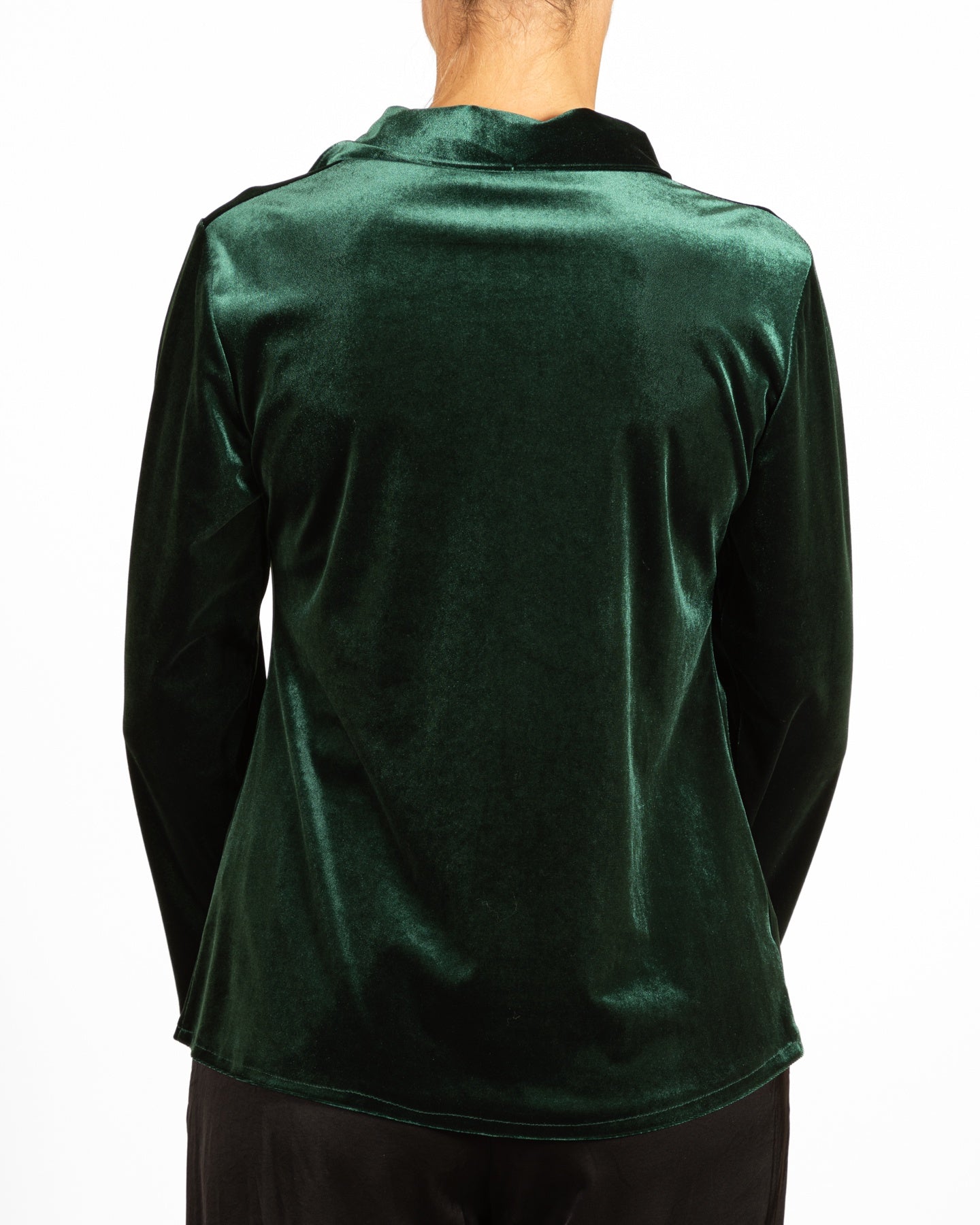 Sublimez votre allure avec ce chemisier en velours émeraude à boutons, orné d'un détail froncé sur le devant pour une touche de texture et d'élégance. Ses manches longues et son toucher luxueux en font la pièce idéale pour les grandes occasions.